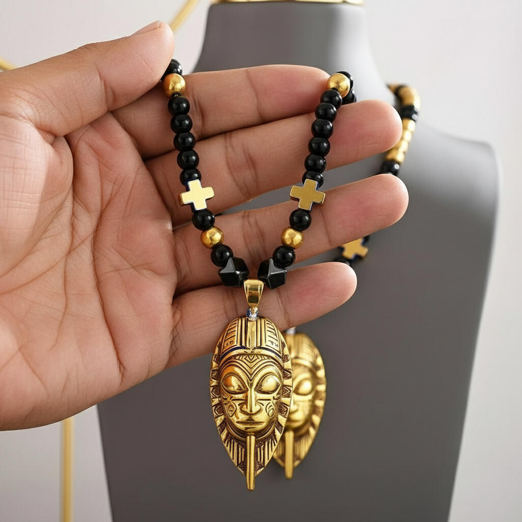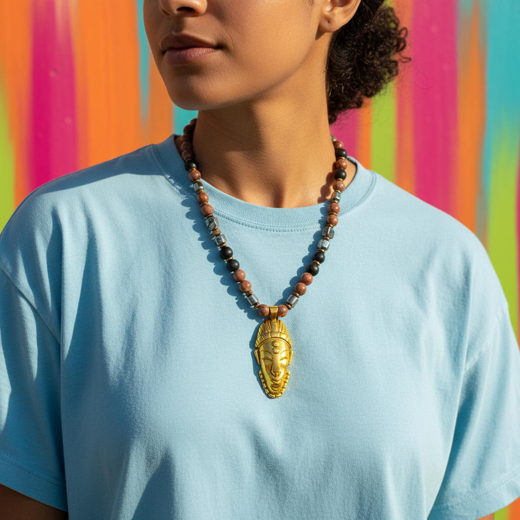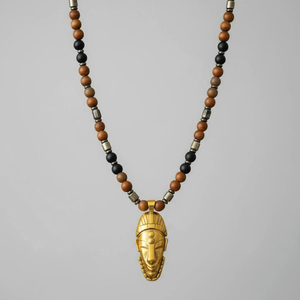 The gold African mask pendant sits at the center as a sign of dominion and self-mastery.