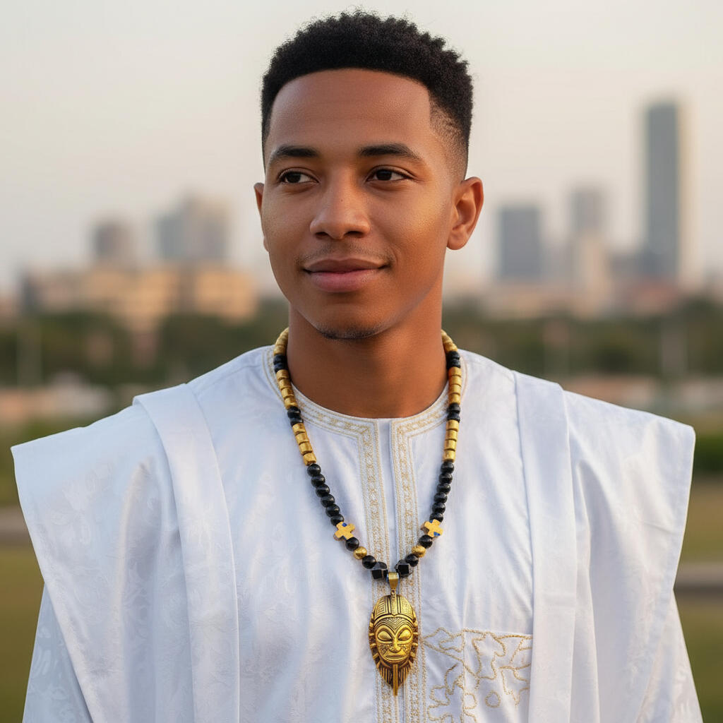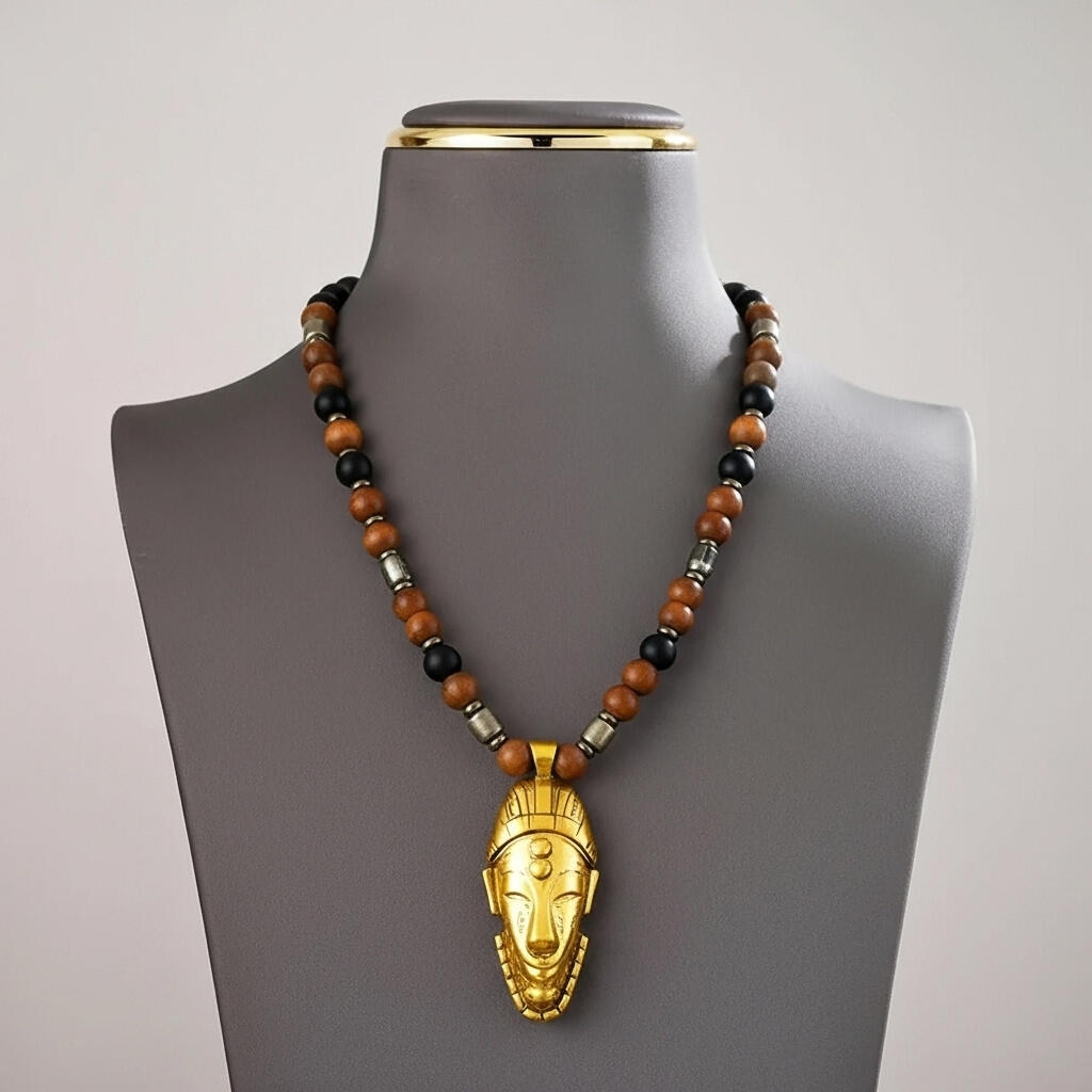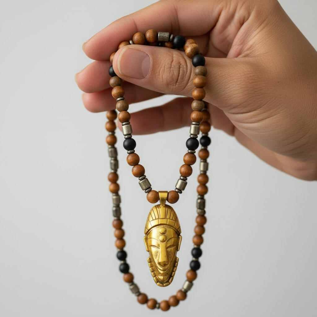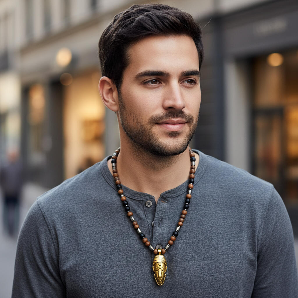 The gold African mask pendant sits at the center as a sign of dominion and self-mastery.