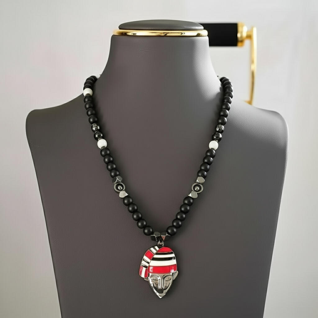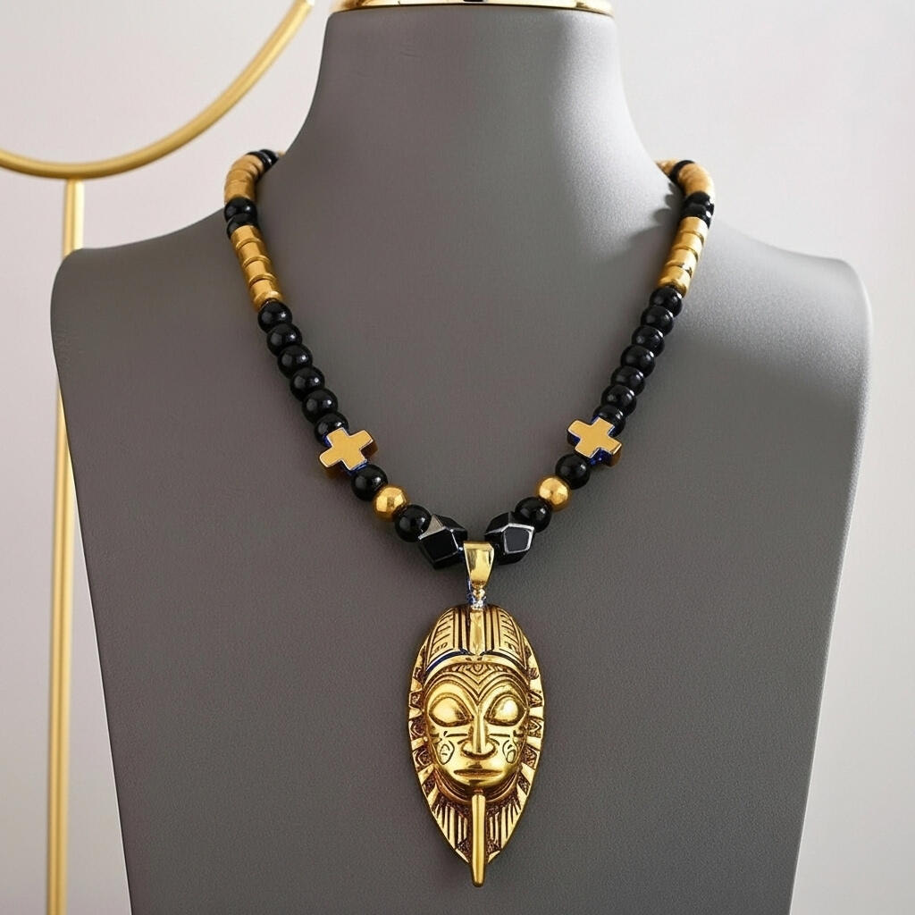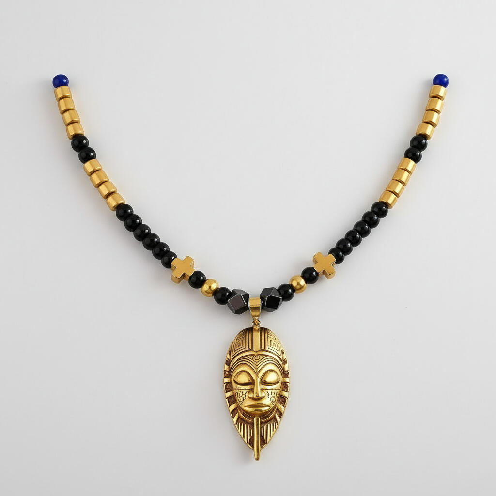 At the center is a bold gold African mask pendant.